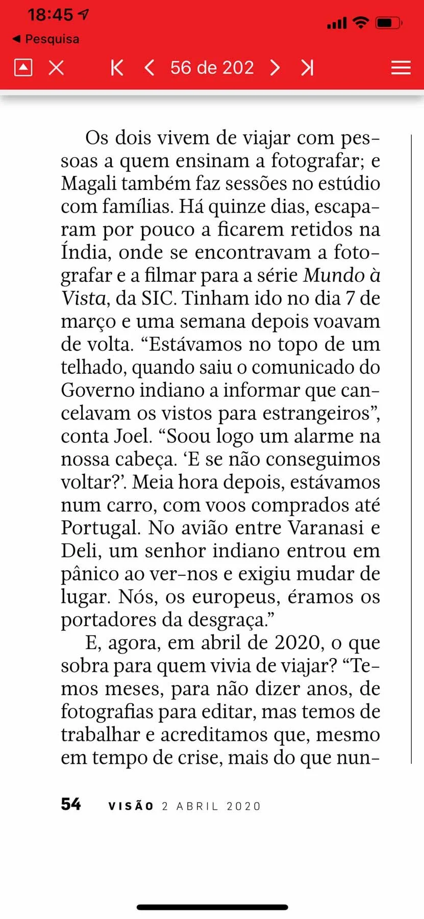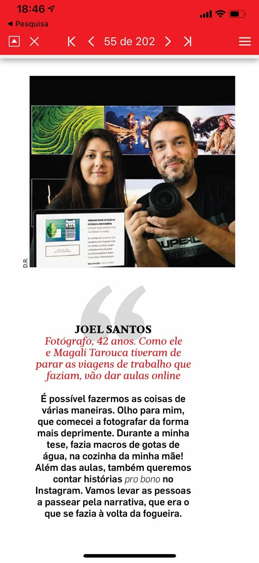 A minha evolução como fotógrafo tem sido lenta. Eu tentava há algum tempo participar de alguns dos cursos e workshops de Joel e Magali. Viver em Faro não facilitou, por isso fiquei agradecida pela oportunidade online. Eu realmente aprendi muito com as duas sessões de formação. Alguns equívocos foram esclarecidos e eu entendo cada vez mais o quanto a fotografia requer concentração. Os detalhes a considerar. O que mais gostei, e aprecio muito, foi sua simplicidade e sentido de humor. Não havia uma atitude de "sabemos mais, somos melhores", apenas comentários reais e construtivos para nos fazer pensar melhor, melhorar a nós mesmos. Por isso, sou grata. Obrigado Joel e Magali!